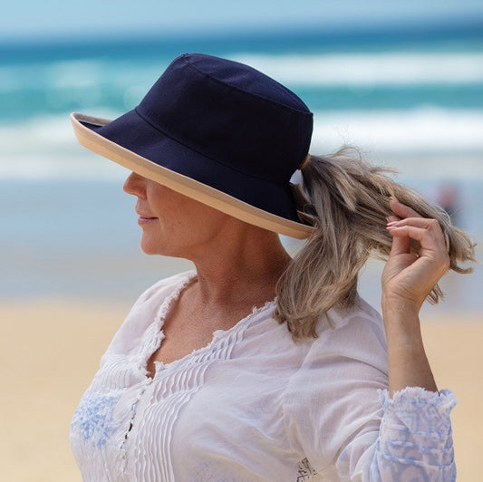 Reversible Ponytail Hat - Camel/Navy Cotton