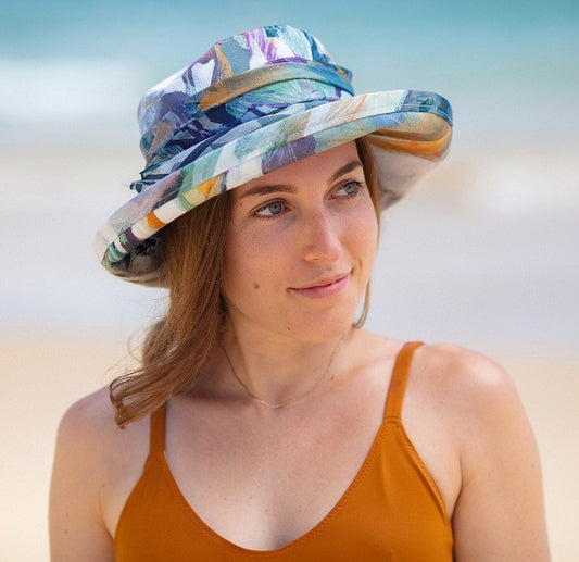 Topshow's wearable art collection features collaborations with local Australian artists with a focus on bold and vibrant colours. Showcasing the same quality materials, craftsmanship and UPF 50+ sun protection of our classic Noosa hat, our wearable art edition will be a mainstay in your collection for years to come. We have also printed these works onto silk scarves, bandanas and cotton sarongs